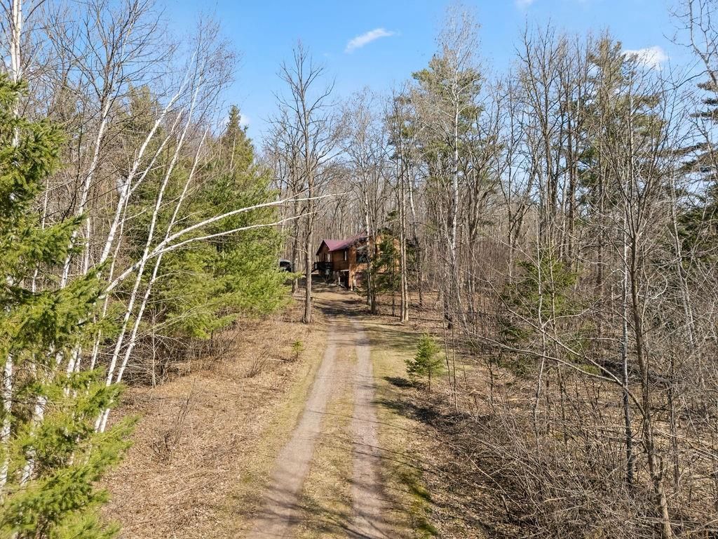 Welcome home to this wooded retreat, tucked into a serene hillside just steps from Lake Chetac. Surrounded by mature trees, this property offers a quiet, secluded setting with large windows that fill the home with natural light and showcases the beautiful views. Inside, the tastefully decorated home features 2 bedrooms and 2 bathrooms, along with convenient main floor laundry. The lower level offers additional space ready for your personal touch?perfect for expanding living or entertaining areas. A spacious 23x23 attached two-car garage provides easy access year-round. Situated on just under 5 acres, you'll appreciate the privacy and natural beauty in every direction with wildlife galore! Whether you're enjoying a warm cup of coffee by the fireplace or relaxing on the covered deck, this peaceful setting brings a sense of tranquility to everyday living.