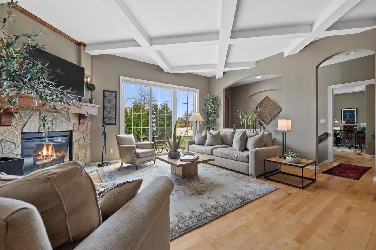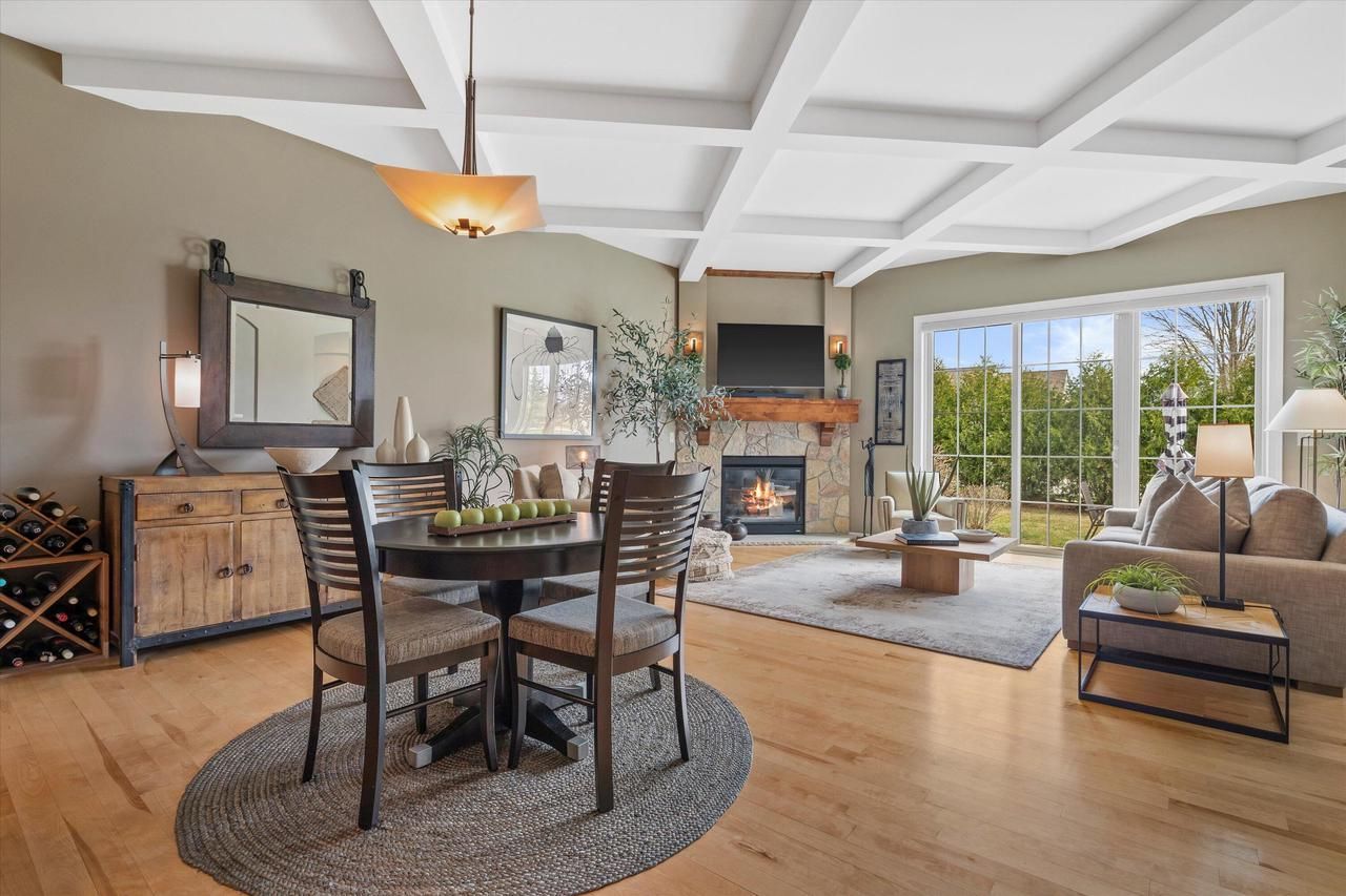 OCONOMOWOC.. Built in 2015 by Kingsway Builders, this stunning condo blends timeless elegance w/ modern comfort. Soaring 10-foot beamed ceilings & rich hardwood floors create a warm, inviting atmosphere throughout the main living spaces. The chef's kitchen is a true centerpiece, featuring premium Viking appliances, custom mahogany cabinetry, & ample space for entertaining. A versatile guest room with a Murphy bed easily functions as a stylish home office. The spacious primary suite offers a private retreat w/ California Closets & a beautifully designed bath. The great room is anchored by a cozy gas fireplace & enhanced by tasteful Restoration Hardware-inspired decor, including statement mirrors & custom library shelving. The finished LL offers a 3rd bedroom, full bath and family room.