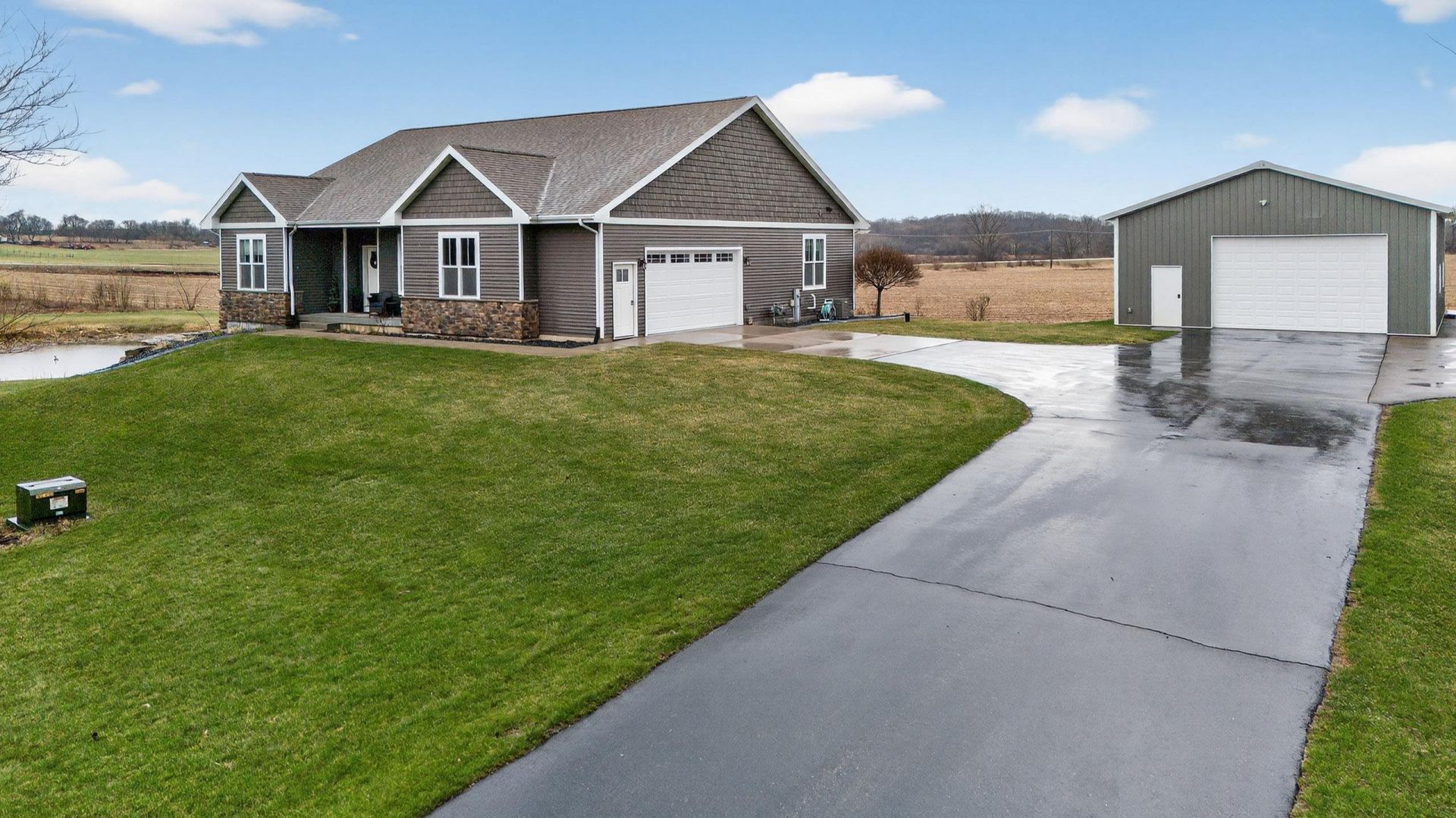 Show 4/15. Stunning ranch on 2.59 acres directly across from the Stoughton Country Club golf course! This 4-bedroom, 3-bath home offers over 3,300 sqft with an open-concept layout and 9' ceilings throughout. The main level features a bright living room with vaulted ceilings, a spacious kitchen with granite countertops, tile backsplash, and stainless steel appliances, plus a spacious primary suite with tray ceilings, dual vanity, walk-in shower, and large closet. The exposed walkout lower level is perfect for entertaining with a family room, gas fireplace, wet bar, additional bedrooms, and full bath. Enjoy outdoor living with a three-season porch, patio with hot tub, firepit area, and expansive yard. Additional highlights include a mudroom with main floor laundry and yard sprinkler system. Ample garage and driveway space includes an attached 2-car garage and a detached extra-deep 2-car garage with a dedicated workspace. Option to purchase fully furnished for a true turn-key opportunity!