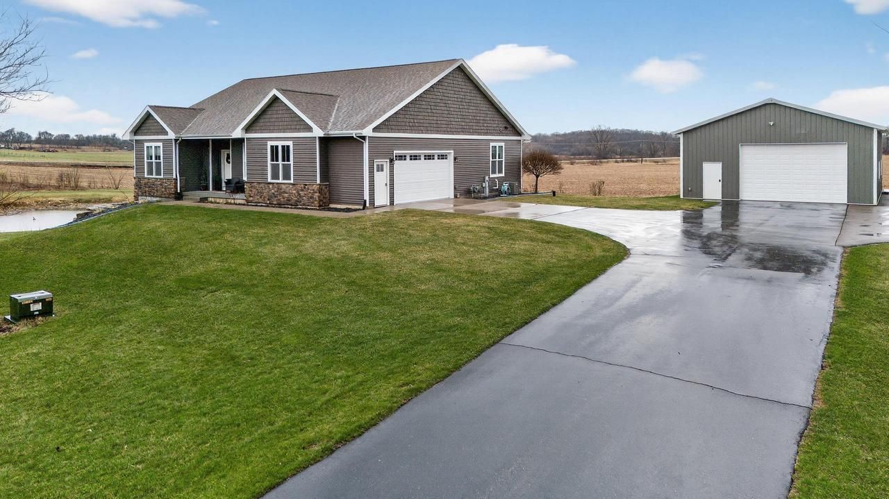 Show 4/15. Stunning ranch on 2.59 acres directly across from the Stoughton Country Club golf course! This 4-bedroom, 3-bath home offers over 3,300 sqft with an open-concept layout and 9? ceilings throughout. The main level features a bright living room with vaulted ceilings, a spacious kitchen with granite countertops, tile backsplash, and stainless steel appliances, plus a spacious primary suite with tray ceilings, dual vanity, walk-in shower, and large closet. The exposed walkout lower level is perfect for entertaining with a family room, gas fireplace, wet bar, additional bedrooms, and full bath. Enjoy outdoor living with a three-season porch, patio with hot tub, firepit area, and expansive yard. Additional highlights include a mudroom with main floor laundry and yard sprinkler system. Ample garage and driveway space includes an attached 2-car garage and a detached extra-deep 2-car garage with a dedicated workspace. Option to purchase fully furnished for a true turn-key opportunity!