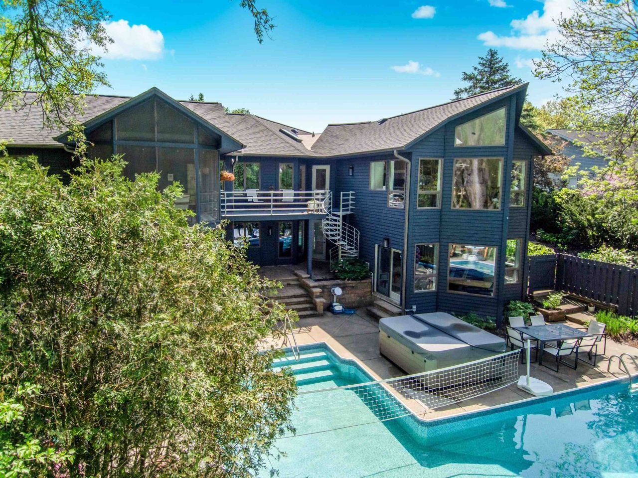 Show 4/16 Stunning inside and out, this home was thoughtfully designed to showcase its true highlight, a breathtaking backyard oasis. Flows into the spacious living room with bamboo floors, gas fireplace & access to a remarkable screened porch overlooking an in-ground pool, hot tub, and lush landscaping. The kitchen is a chef's dream that flows into a sun-drenched dining area wrapped in floor-to-ceiling windows. Relax in the main-level primary with its spa-like shower. Downstairs, you'll notice soft cork floors and find 2 beds, 2 full baths, laundry room, and endless rec space. Perfect for entertaining with a wet bar and easy access to patio for poolside gatherings. Plus, a bonus room perfect for office, gym, or cozy retreat. Distinctive architecture and modern details shine throughout. Major updates include new roof, gutters, furnace, exterior paint, and EV charger in attached 2-car garage. Nestled in peaceful neighborhood with convenient access to amenities and Epic. See 3D tour!