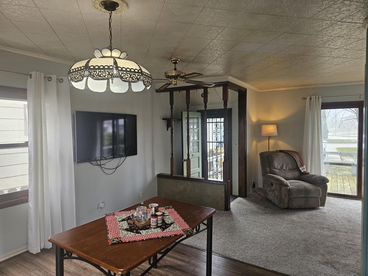Two bedroom home with first floor laundry and walk in shower. Kitchen and living room are open concept. Front deck and two storage sheds, the large one was added in 2021. Large front yard. Home is located close to grocery shopping and restaurants. Updates include: furnace 2017, siding 2020, insulation added throughout the home in 2021. Portable a/c unit included. (see seller improvement sheet for more) Move right in and enjoy this bungalow.